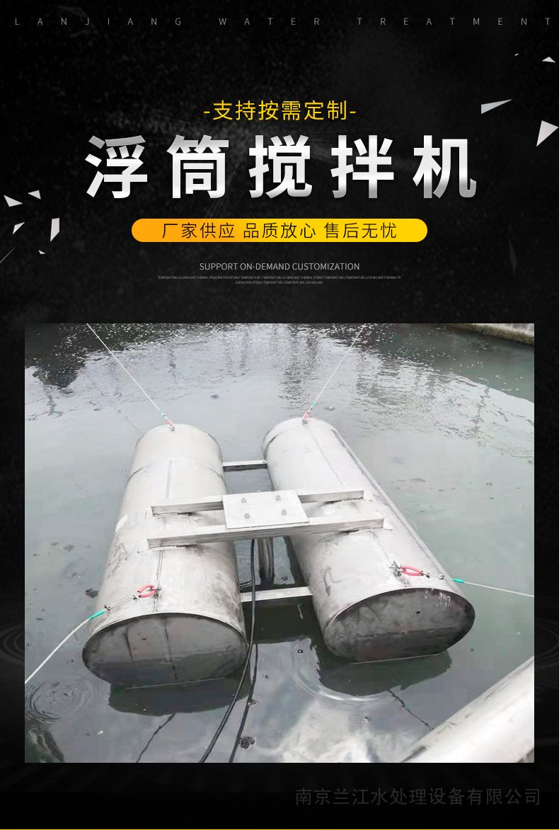 本厂自行开发的潜水型浮筒搅拌机,结构紧凑体积小。中高速搅拌机由浮筒、潜水电机、叶轮、钢丝绳和导杆组成;低速浮筒搅拌机由叶桨、减速机、潜水电机、钢丝绳、主轴和浮筒组成。
