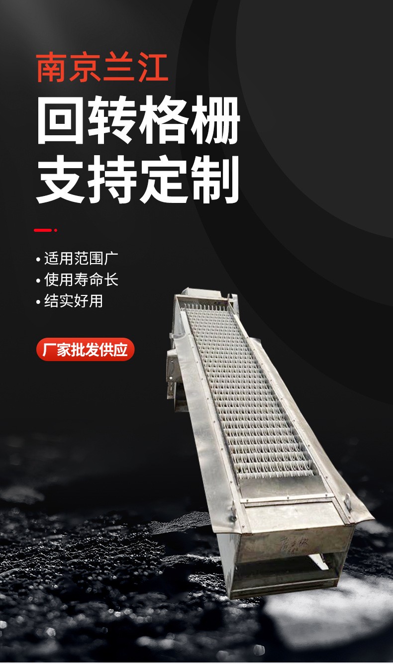 回转式格栅机主要由拦污栅体,回转齿耙,驱动传动机机构,过载保护机构和不锈钢牵引链条等。
